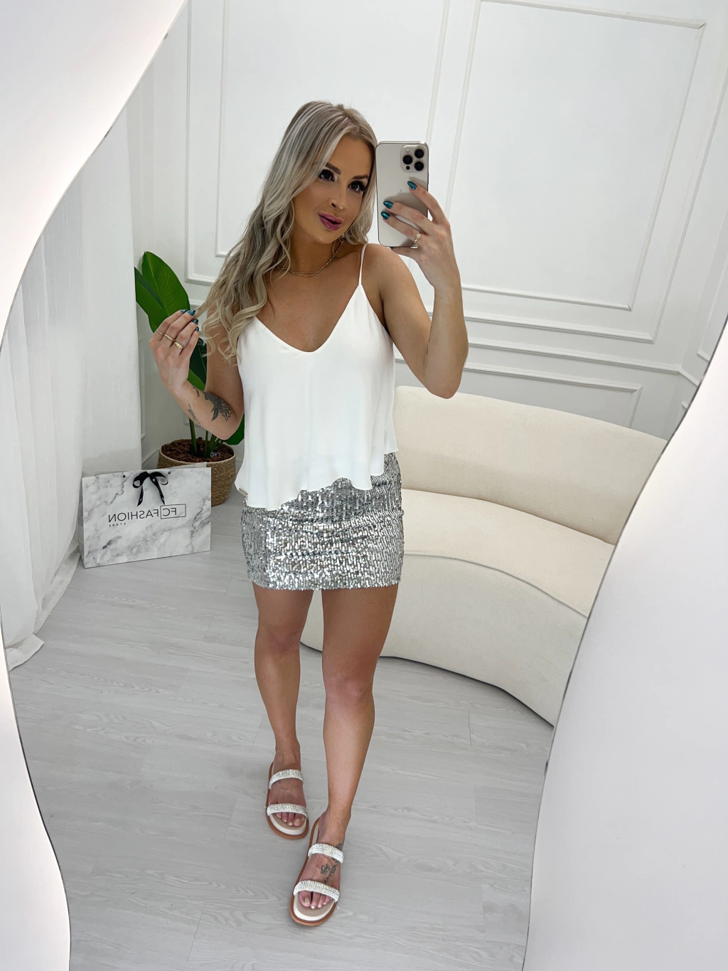 Essa saia é a peça-chave que faltava no seu guarda-roupa! Com uma silhueta acinturada e cintura alta, ela valoriza suas curvas com sofisticação. O comprimento curto adiciona um toque de charme e ousadia, enquanto o paetê 100% feito à mão garante um brilho único em cada detalhe.