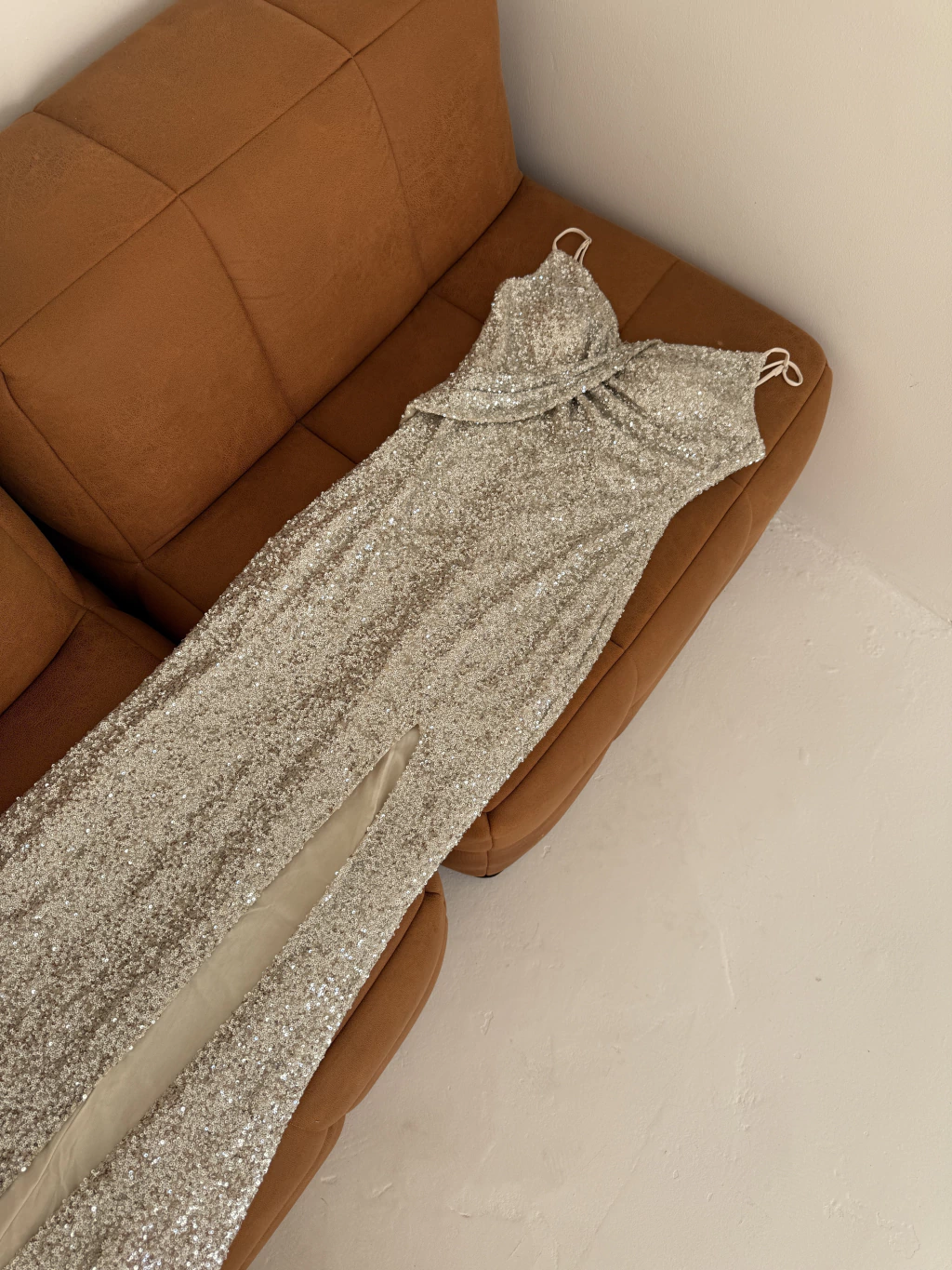 Feito para brilhar, o Vestido Longo Stone é todo bordado em paetês prata, trazendo aquele efeito luxuoso que não passa despercebido. A modelagem ajustada valoriza as curvas, enquanto a fenda lateral poderosa garante movimento e sensualidade na medida certa. O decote em V com alcinhas finas completa o look com elegância.